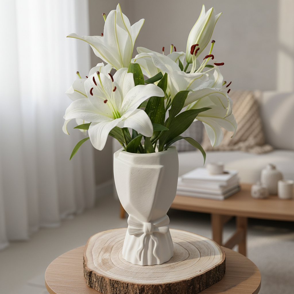 Diese stilvolle Vase überzeugt mit ihrem besonderen Design: Ein fein gearbeitetes Schleifenmotiv verleiht ihr einen charmanten, verspielten Look. Das schlichte Weiß passt zu jeder Einrichtung und lässt sich vielseitig dekorieren – ob mit frischen Blumen, Trockenblumen oder einfach als edles Deko-Objekt. Perfekt für Wohnzimmer, Schlafzimmer oder als Geschenkidee.