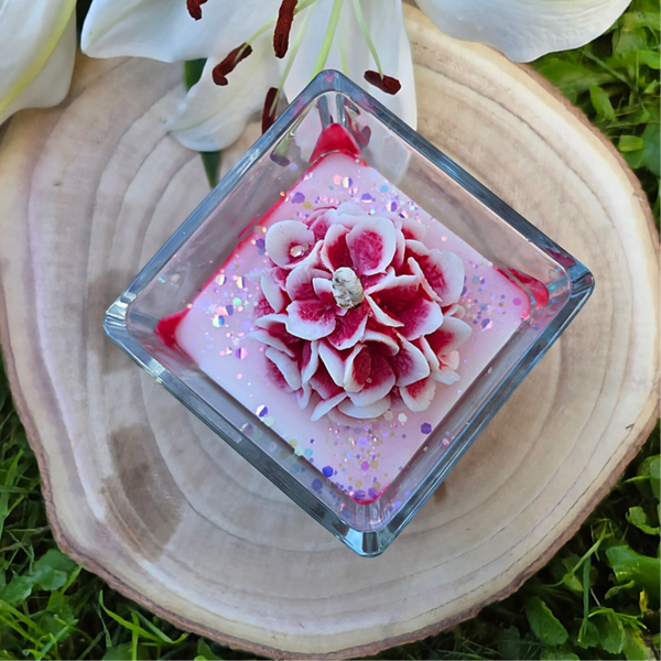 Diese edle, handgegossene Duftkerze im Glas vereint natürliche Eleganz mit kiebevollen Details. Verziert mit zarter rotfarbenen Jasmin Blüte, dekorativen Glitzer und einem Baumwolldocht ist sie ein echter hingucker - perfekt für stilvolle Wohnräume, Hochzeiten oder besondere Anlässe.