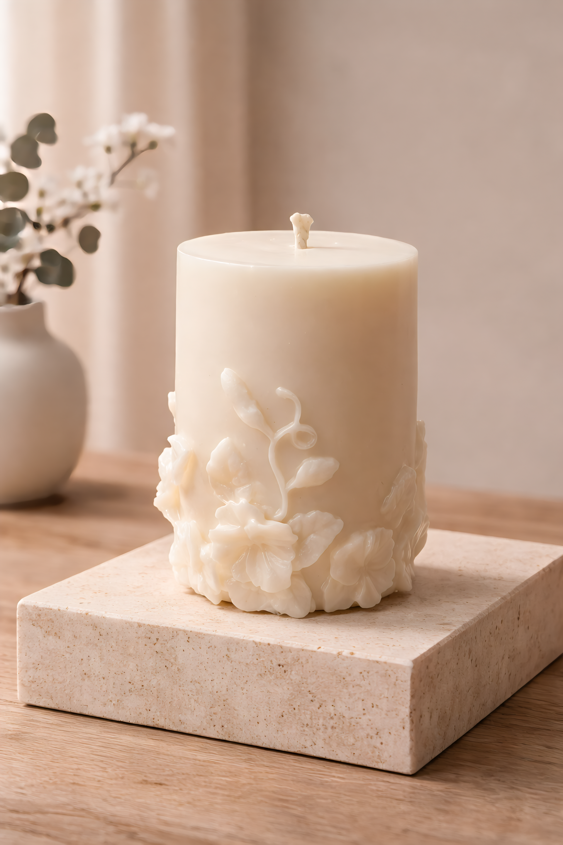 Dieses liebevoll gestaltete 3er Set handgefertigter Standkerzen aus natürlichem Sojawachs bringt eine sanfte, elegante Atmosphäre in dein Zuhause. Jede Kerze ist mit feinen floralen Details verziert und wirkt dadurch wie ein kleines Kunstwerk – perfekt für stilvolle Dekorationen, besondere Anlässe oder als hochwertiges Geschenk.
