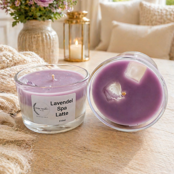 Verwandle dein Zuhause in eine Wohlfühloase mit unseren liebevoll gestalteten Duftkerzen Peach Latte und Lavendel Spa Latte. Diese stilvollen Kerzen im eleganten Glas vereinen sanfte Düfte mit modernem Design und schaffen eine warme, entspannte Atmosphäre.