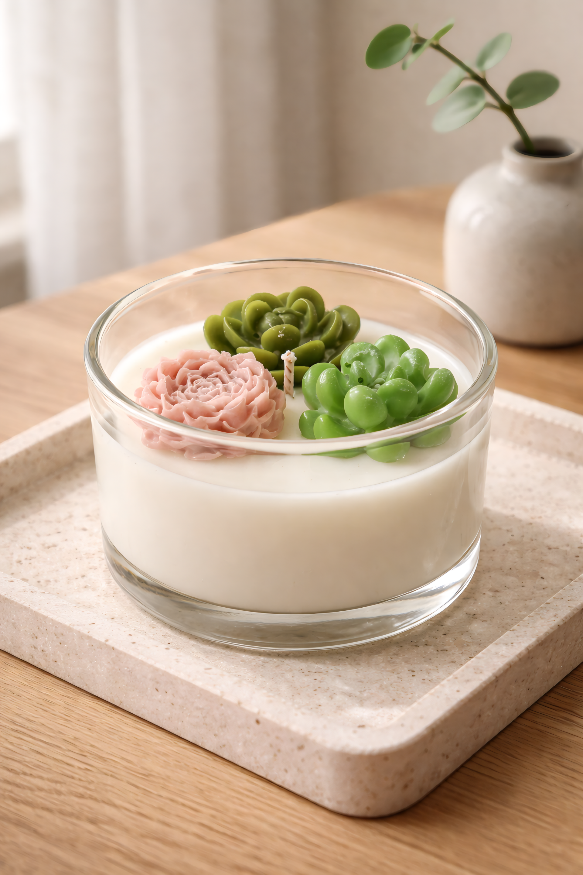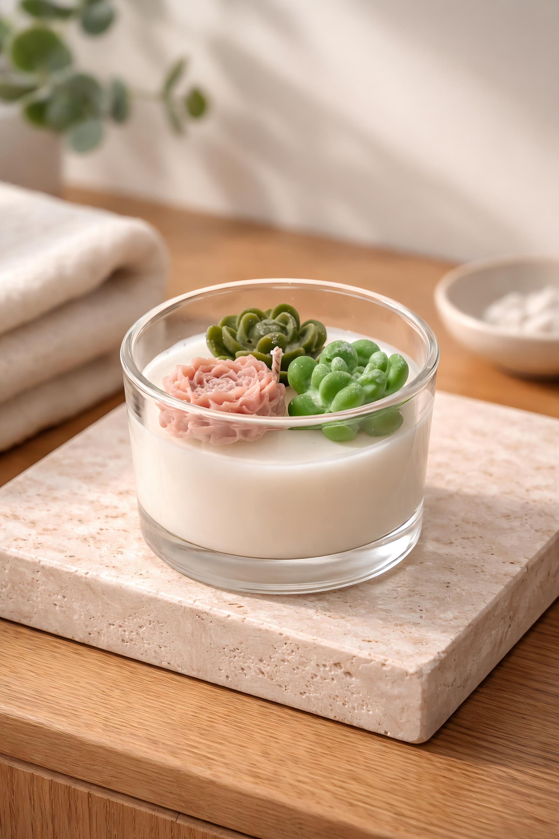 - Handgegossene Kerze mit filigranen Sukkulenten-Details
