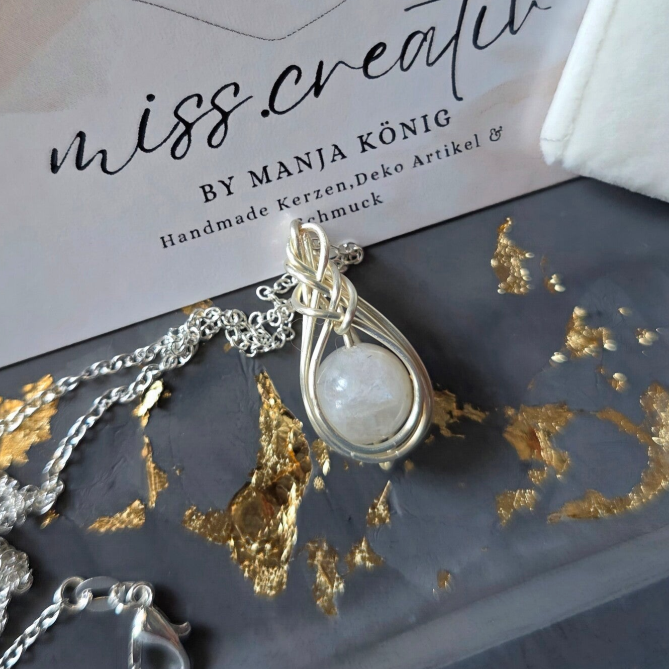 Dieser Anhänger vereint filigrane Drahtkunst mit einer schimmernden Mondsteinperle – ein Symbol für Klarheit, Energie und Eleganz. Jeder Stein ist ein Unikat – mit individueller Maserung und natürlichem Glanz.