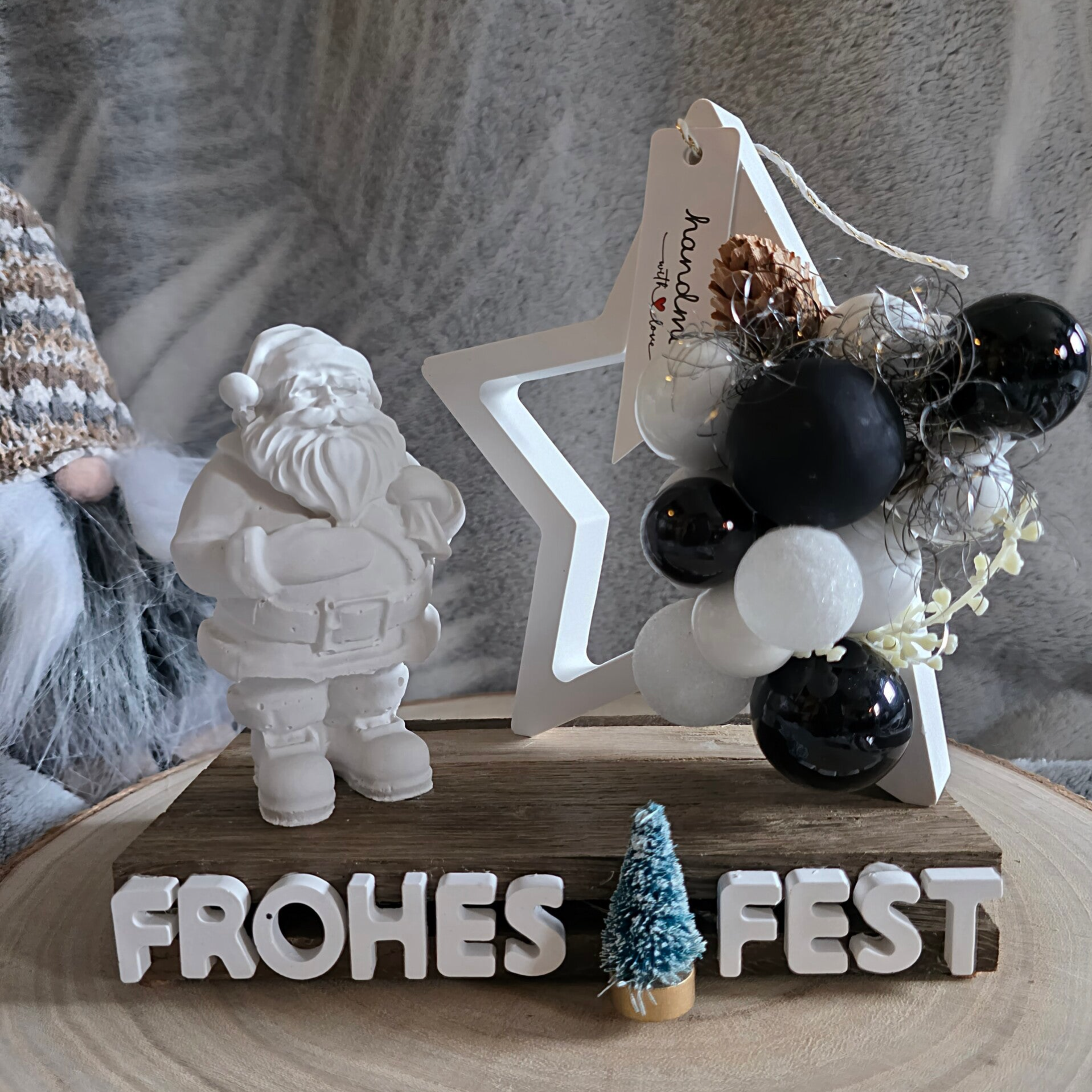 Der leuchtende Stern, der detailreiche Weihnachtsmann, Igel oder Kerzenhalter und der 3D-Schriftzug „FROHES FEST“ machen diese Deko zu einem echten Highlight auf Tisch, Fensterbank oder Regal.