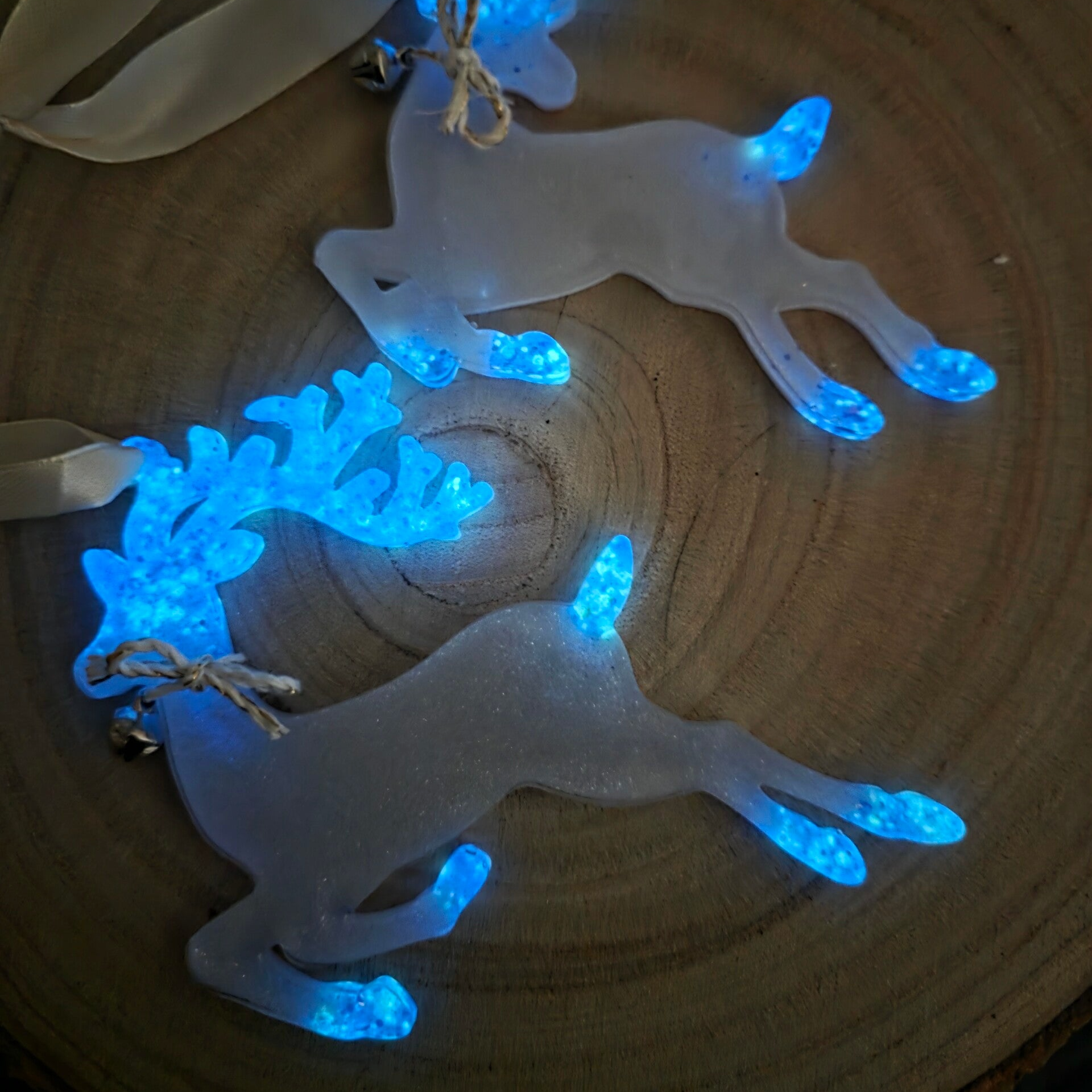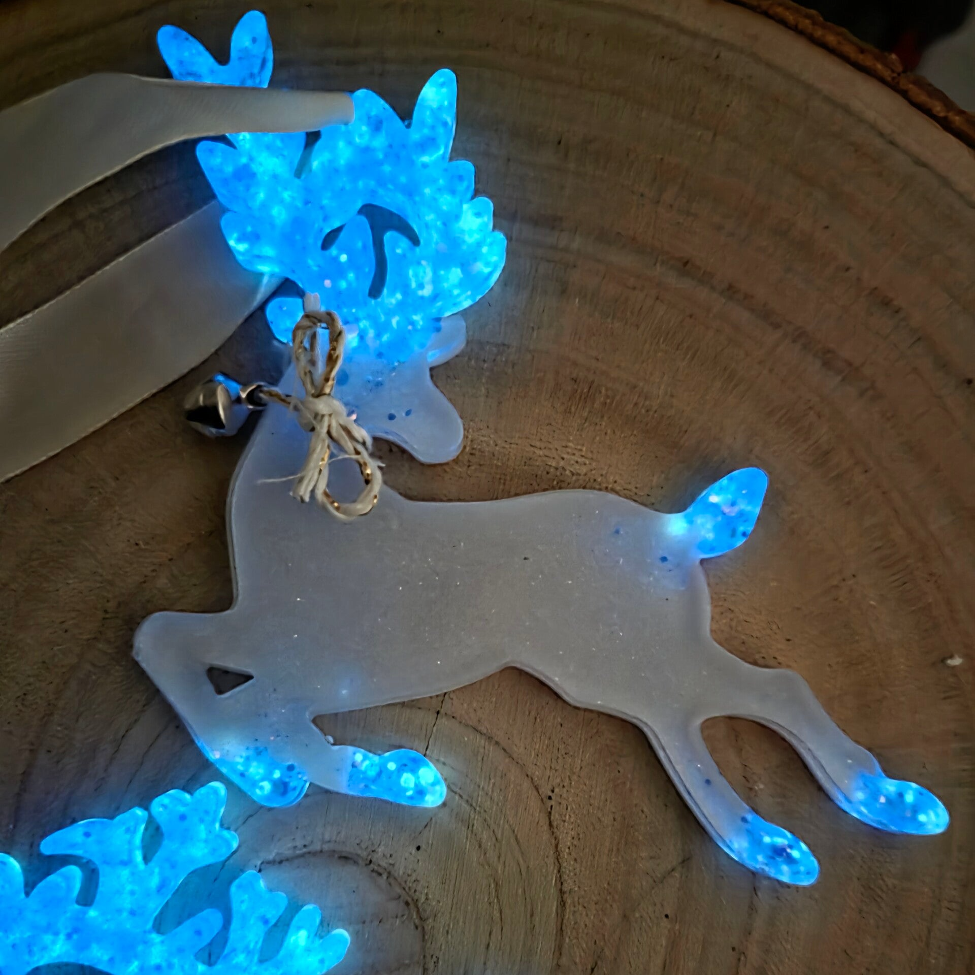 Einzigartiger Tannenbaumschmuck aus Harz mit schimmernden Akzenten, welche im Dunkeln leuchten