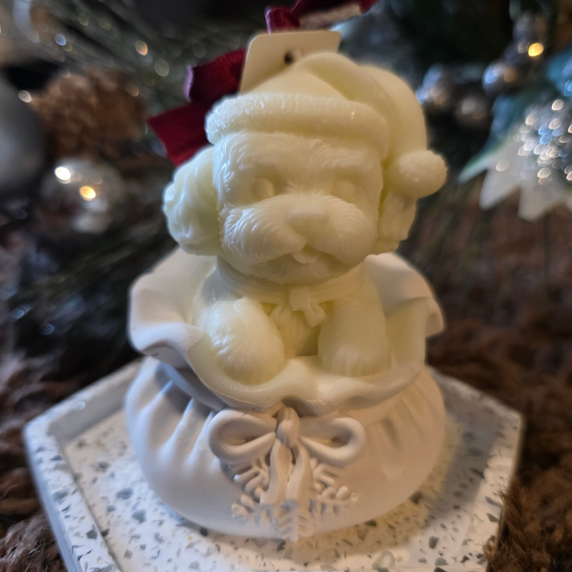 Handgemachte niedliche Hundekerze auf einem Weihnachtlichem Sockel. Diese süsse kleine Kerze kann sowohl als Deko oder auch angezündet werden. Nach Entfernung des wachsen kann der Sockel wiederverwendet werden.