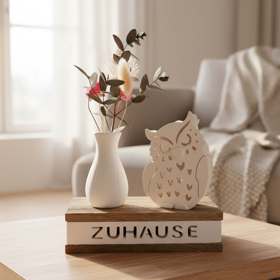 Schaffe eine gemütliche Wohlfühlatmosphäre mit dieser liebevoll gestalteten LED-Dekoeule & Mini Dekovase mit Holzsockel. Das warmweiße Licht bringt nicht nur die detailreiche Eulenform wunderschön zur Geltung, sondern lässt auch den Schriftzug „ZUHAUSE“ sanft erstrahlen – ein echtes Statement für Geborgenheit und Stil.