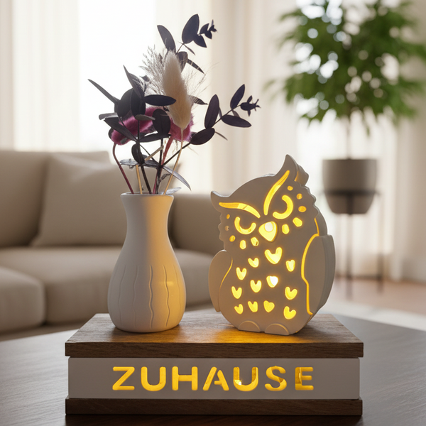 Lichtsockel "ZUHAUSE" mit Eule und Blumenvase