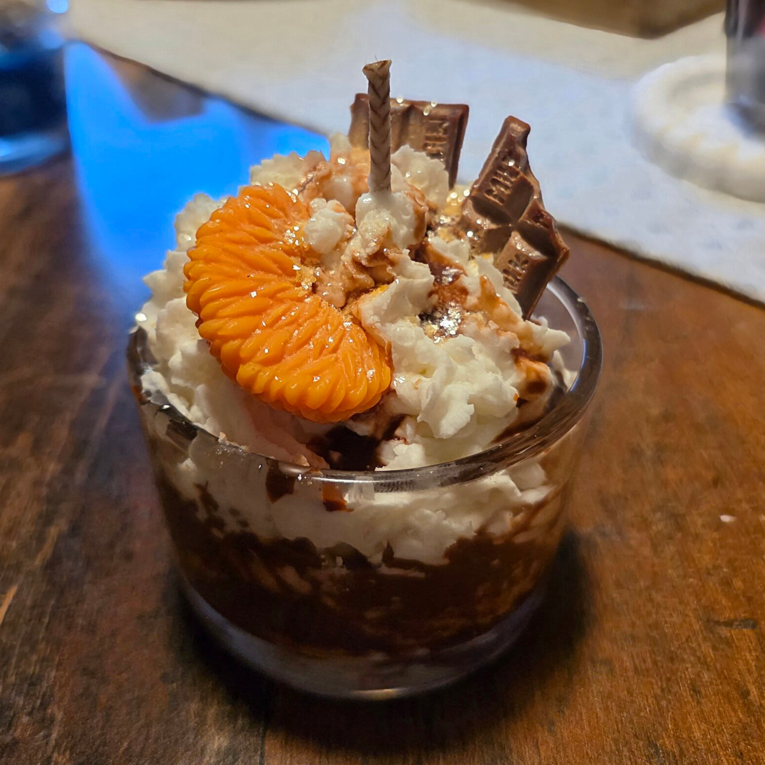 Diese außergewöhnliche Schokokerze sieht aus wie ein edles Dessert im Glas und ist ein echter Hingucker für jedes Zuhause. Mit liebevollen Details wie schokoladigen Strukturen, cremiger Optik und dekorativen Akzenten erinnert sie an ein frisch serviertes Schoko-Dessert aus einem Café – ganz ohne Kalorien.